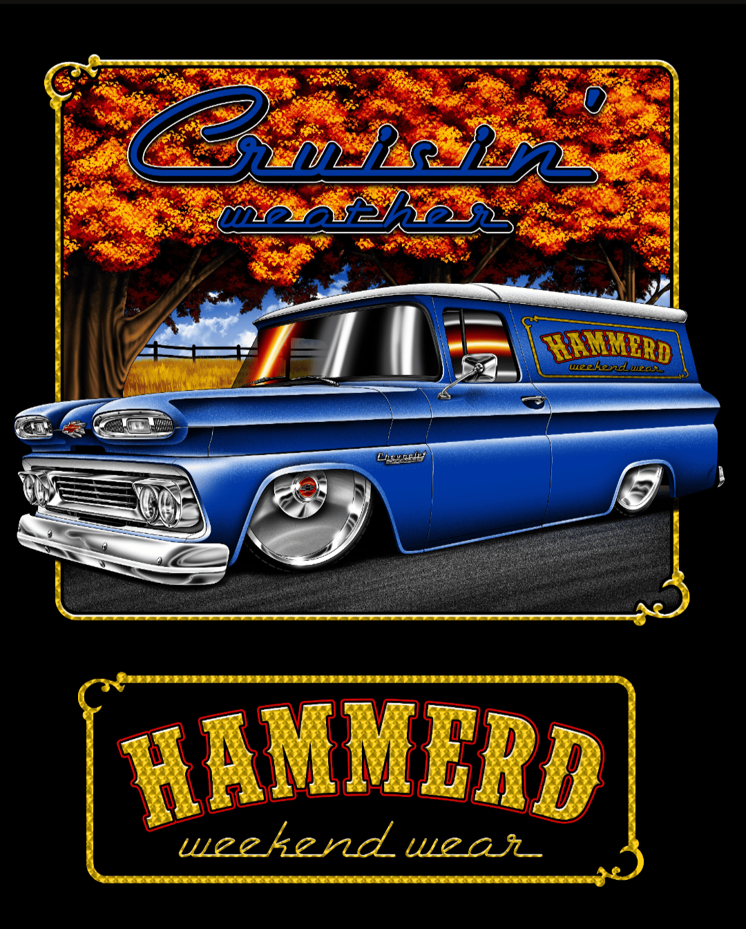 Fall is here, and so is the perfect season to cruise. Our newest design, “Cruisin’ Weather,” brings together crisp autumn colors, classic style, and pure Hammerd attitude.