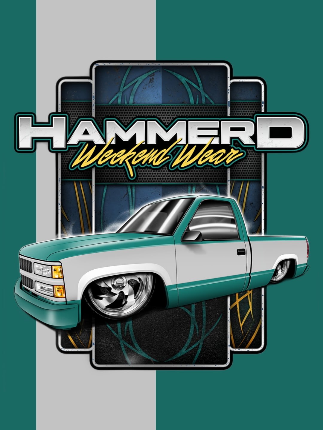 HammerD Weekend Wear pays tribute to the era that shaped an entire scene — the Chevy OBS. This design captures the perfect balance of clean lines and bold attitude, featuring a teal-and-white hammerd 😉 classic sitting 'oh so low' on billet wheels. The layered background hits with textured steel and teal tribal accents, giving a nod to the custom roots that built the street trucks movement.